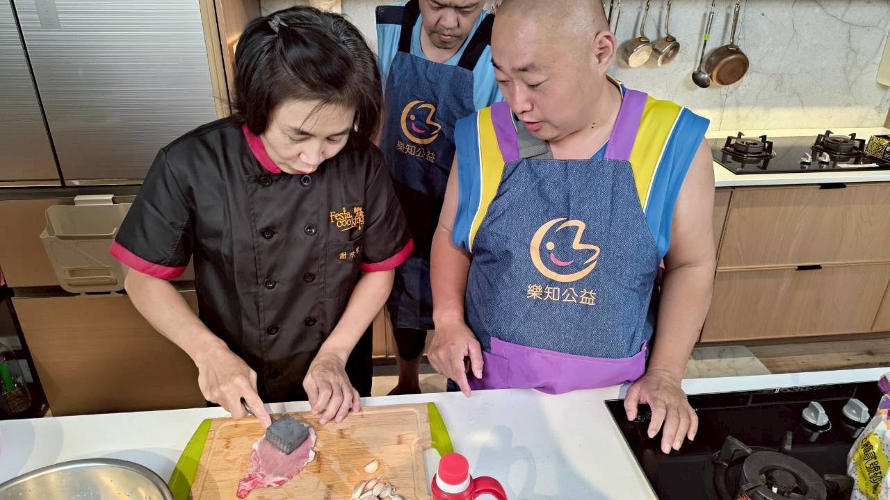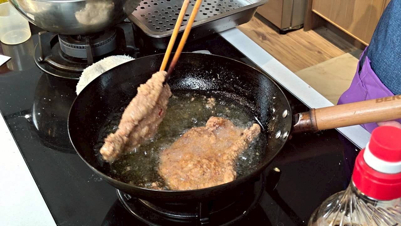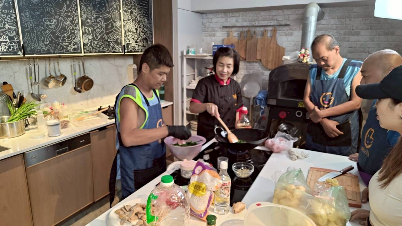 「這顏色好完美!」學員們看著油鍋裡金黃酥脆的排骨,忍不住發出驚嘆聲,還有人拿起鏟子比劃起「大廚」的姿勢,逗得大家哈哈大笑;雖然有人因翻鍋太快讓油濺上圍裙,但也在旁人的幫忙下,一邊擦拭一邊互相取笑自娛,絲毫沒有影響到大家的好心情。