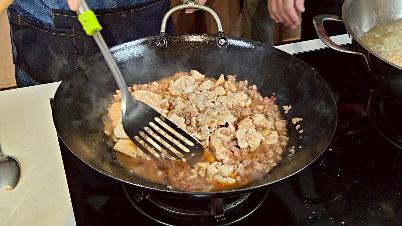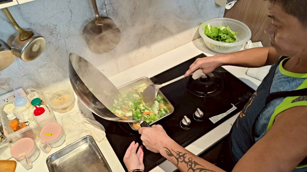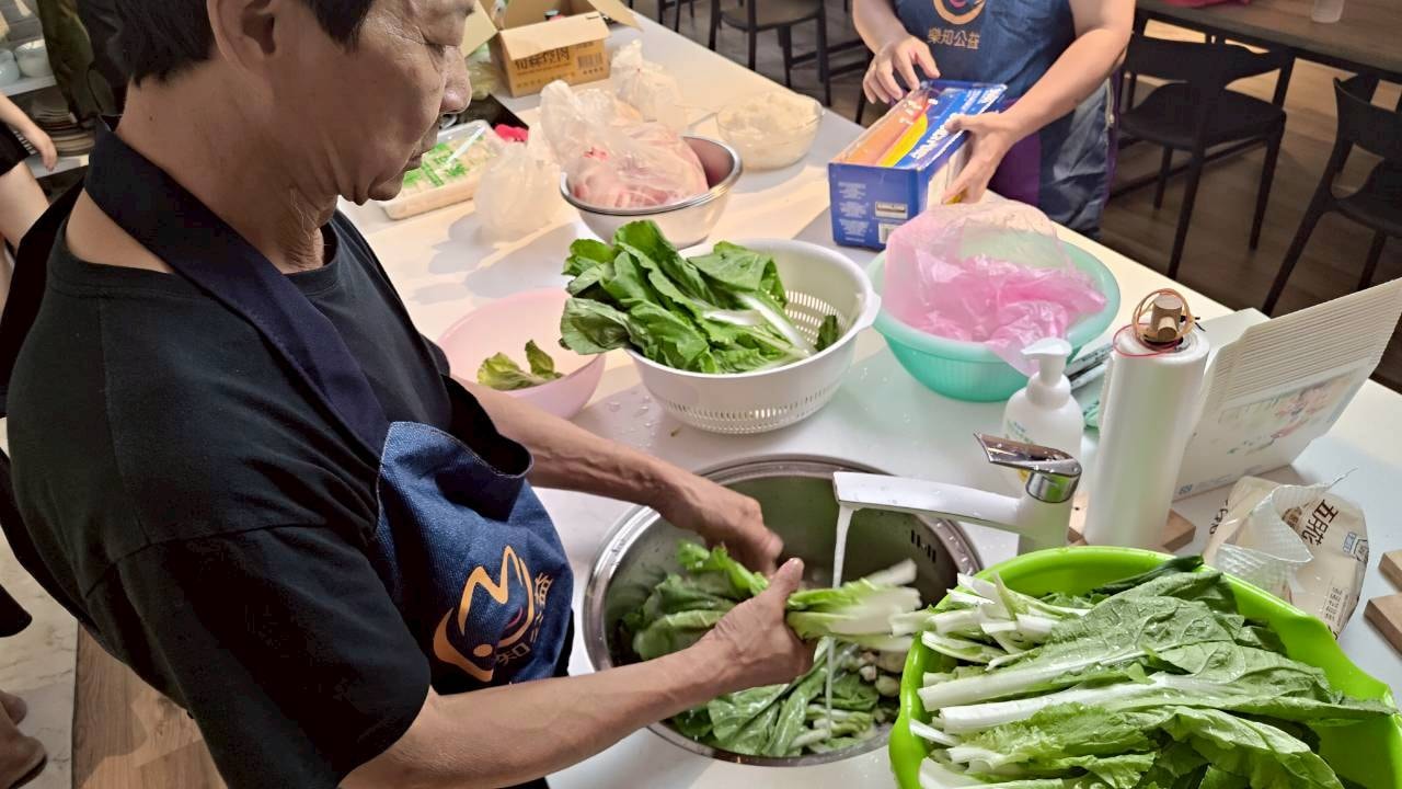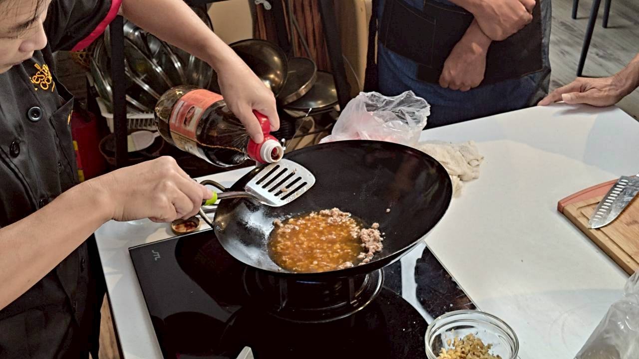 「這顏色好完美!」學員們看著油鍋裡金黃酥脆的排骨,忍不住發出驚嘆聲,還有人拿起鏟子比劃起「大廚」的姿勢,逗得大家哈哈大笑;雖然有人因翻鍋太快讓油濺上圍裙,但也在旁人的幫忙下,一邊擦拭一邊互相取笑自娛,絲毫沒有影響到大家的好心情。